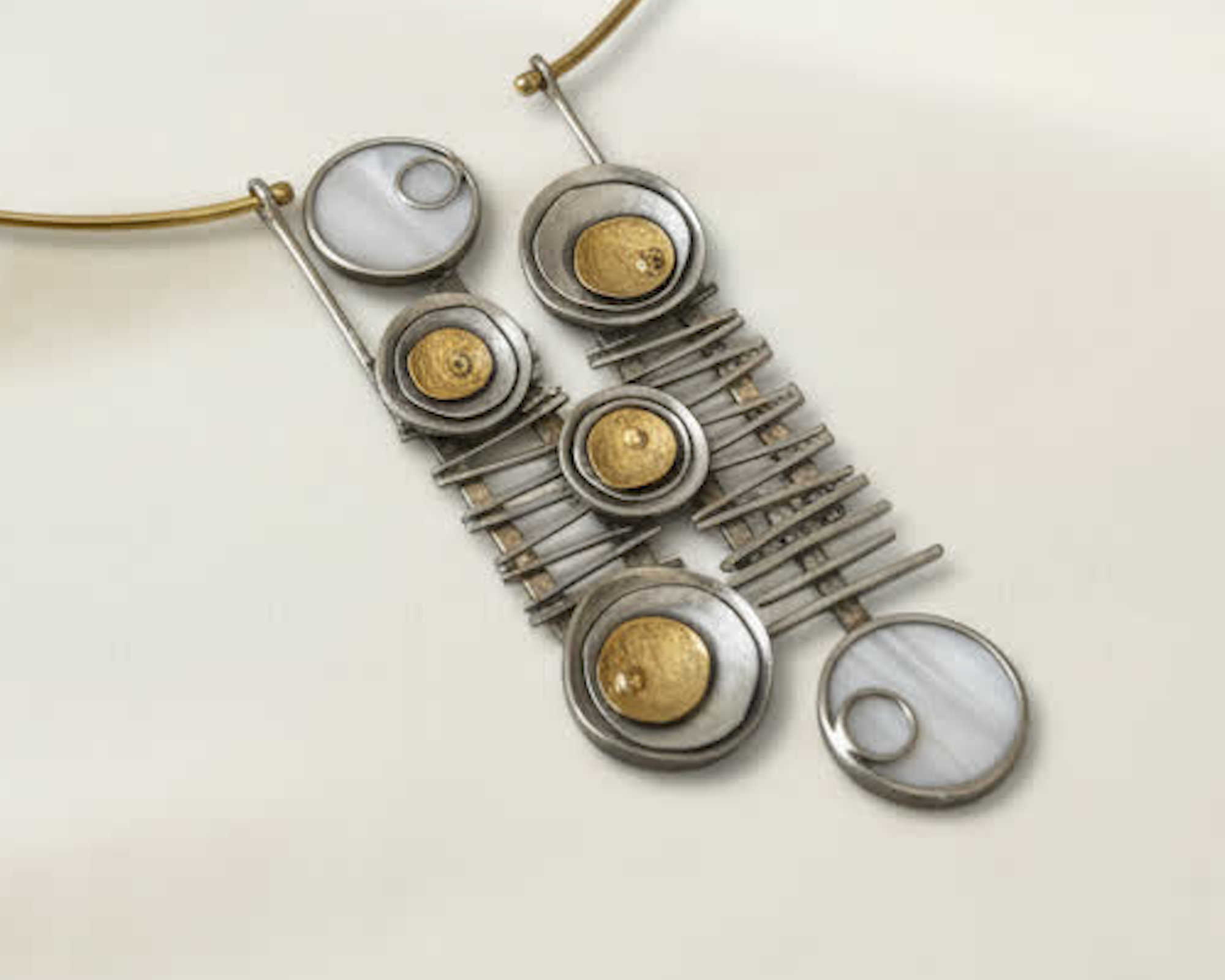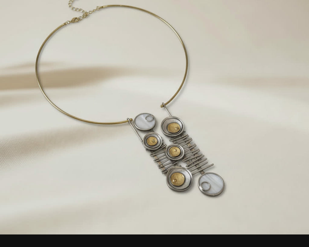 Own the spotlight with this architectural two-tone collar necklace and earrings set, where sleek silver lines frame golden accents in a striking geometric design. Perfect for fashion-forward women who love edgy, art-inspired style.